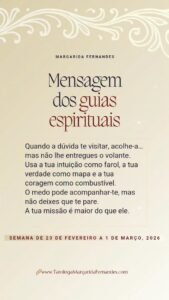 | Conselho: | 2026 será o ano das escolhas conscientes. Nem tudo o que o coração deseja é o que a Alma precisa e é essa diferença que o Universo quer que aprenda. Siga o caminho que o faz crescer, mesmo que implique deixar algo para trás. Quando agir com verdade, tudo o resto se alinhará naturalmente. |